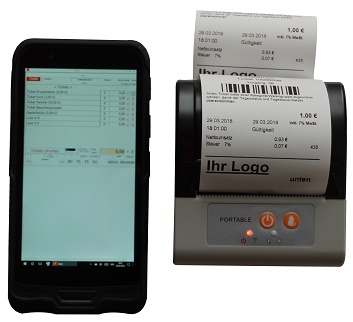 Drucken der Tickets und Bons mit Barcode (Ticketidentnummer).